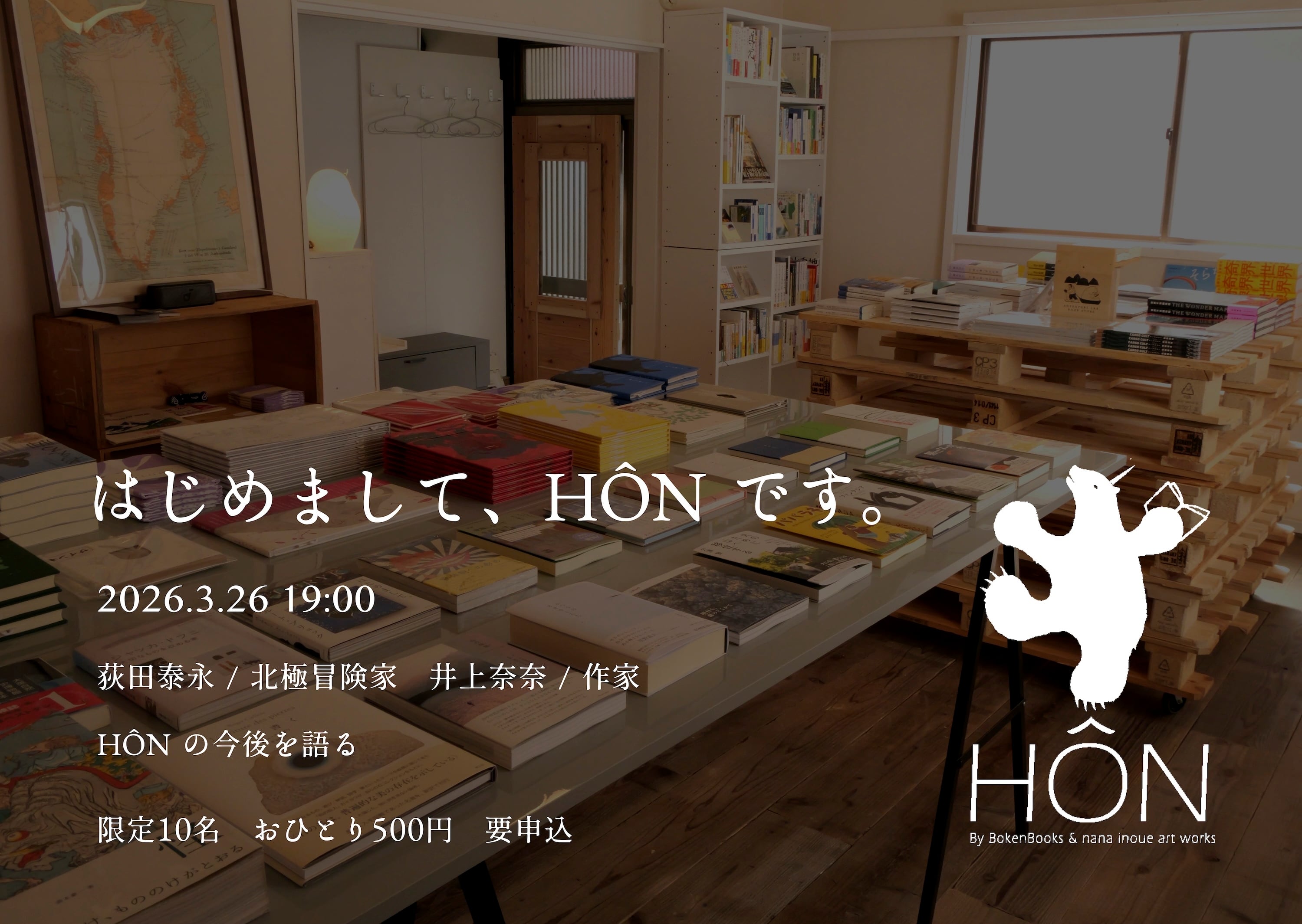 3月26日(木)19時より、HÔN(ホーン)にて、冒険研究所書店の荻田泰永と井上奈奈により、これからHÔNをどのように動かしていくか、いまのイメージを語りながら、来場の皆さんとも話しながらこれからの展開を考えたいと思っています。